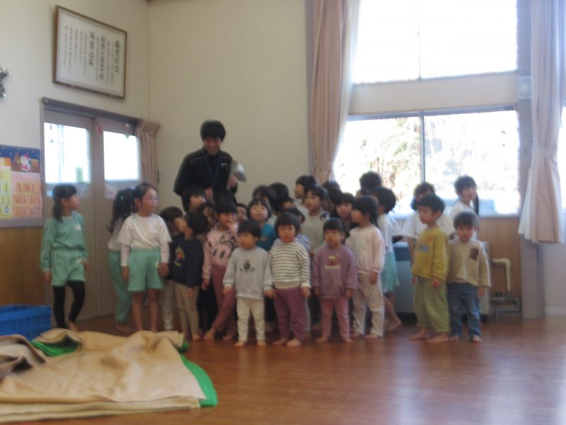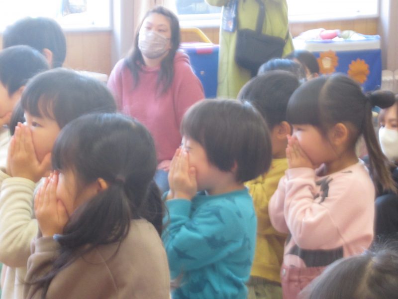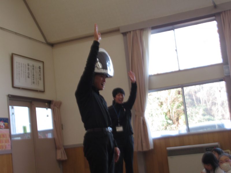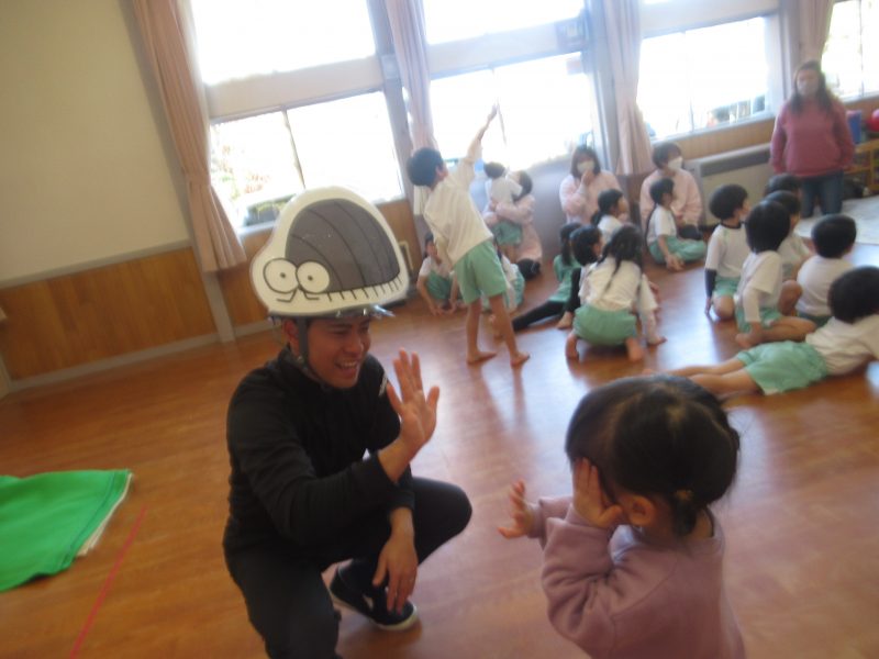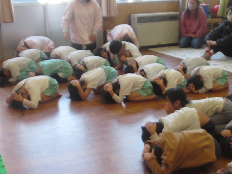 地震時の身の守り方(ダンゴムシポーズ)だけでなく火災時の煙から身を守るポーズ(アライグマポーズ)、津波時は急いで逃げるという(チーターポーズ)等、子どもたちにわかりやすい表現で大切な事を沢山教えていただきました。