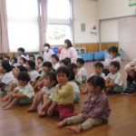 9月25日、常盤台にあるグループホーム「愛の家」の方々が来園され、すずめ、ひばり、つばめ組の子どもたちが遊戯を披露したり、一緒にふれあいタイム「肩たたき」を行ったりと交流を楽しみました。